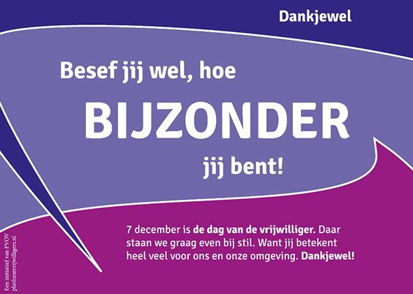 Met dit kaartje willen we iedereen bedanken voor de onmisbare inzet in de wereld van vrijwilligers! Wil jij dit kaartje ook naar iemand in jouw omgeving sturen, dat mag!